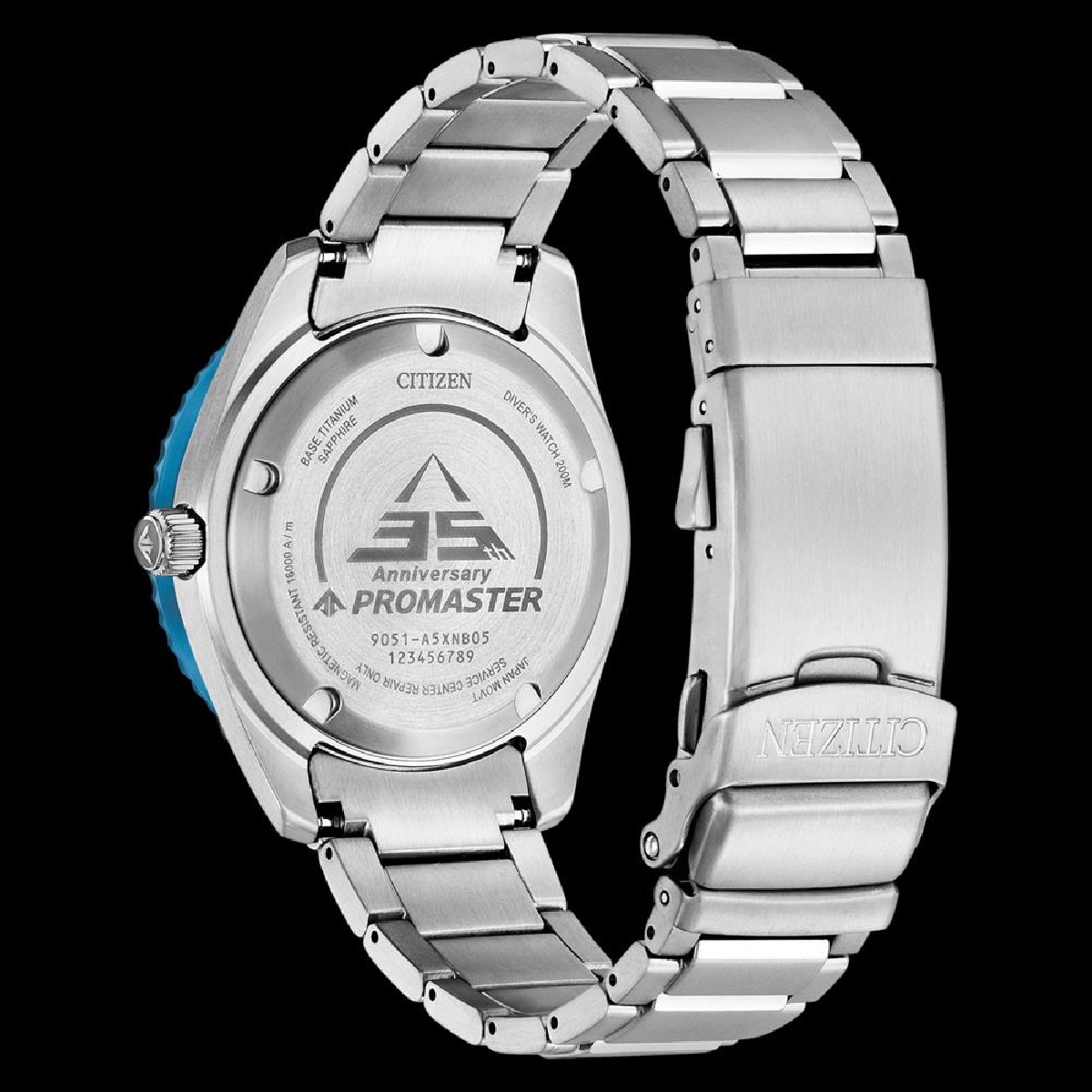 Caixa em Super Titanium Duratect Platinum, 12,3 mm de espessura, com fundo da caixa a rosca (logótipo do 35.º aniversário) e coroa. Bracelete em Super Titanium Duratect Platinum. Bisel ST azul. Cristal de safira plano. Luminous. WR 20 bar.
