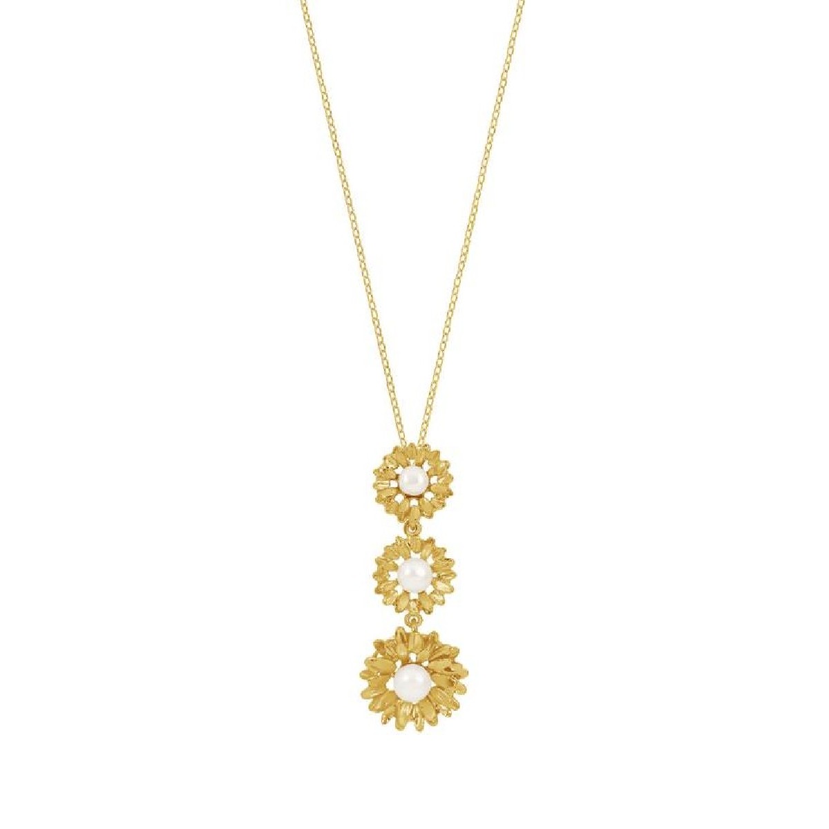 Colar Alma III em prata de lei, banhado a ouro amarelo, com pérolas e flor. Alma representa a vida. A vida é a história que construímos com várias emoções, sentimentos e desejos.