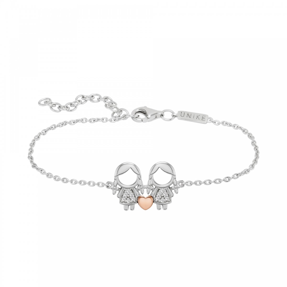 A coleção Mum revela Mum Girl & Girl, pulseira em prata de lei 925, com dois pendentes em forma de menina com zircónias cravadas. Ao centro um coração com banho de ouro rosa. Para celebrar momentos especiais em família todos os dias.