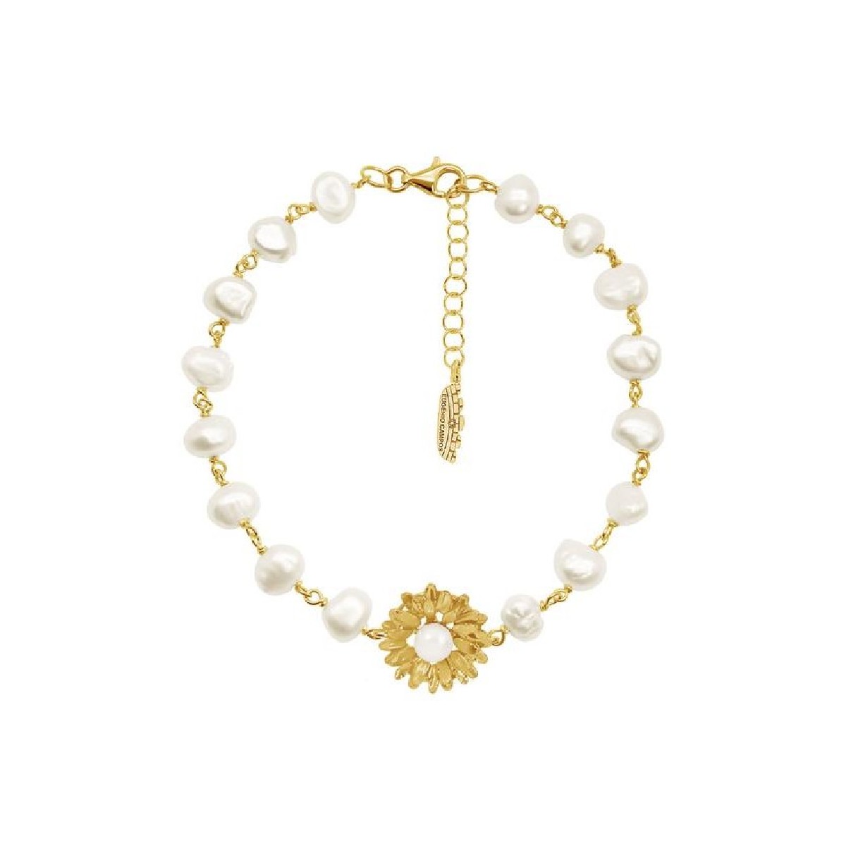Pulseira Alma em prata de lei, banhada a ouro amarelo, com pérolas e flor. Alma representa a vida. A vida é a história que construímos com várias emoções, sentimentos e desejos.